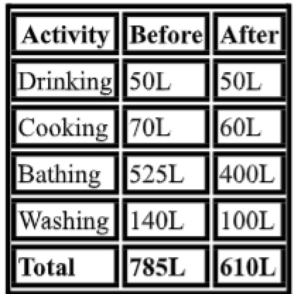 - Washing Clothes: Daily washing took about 20 liters per day, which is 140 liters a week.